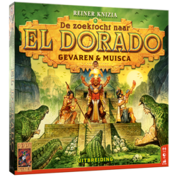 New adventures in the Quest for El Dorado! This expansion introduces the new modules "Dangers" and "Muisca." The Muisca are a mysterious tribe that wants to help you find the City of Gold. "Dangers" brings new challenges, such as crocodiles, rapids, and temples with keys to the City of Gold. Combine with new cave tokens for even more variety!