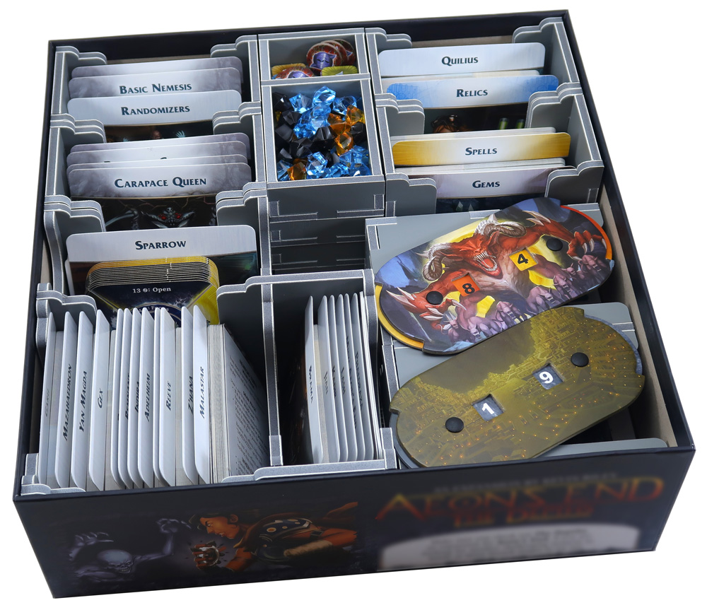 Bij gebruik met de Aeon’s End: Outcasts®-versie van het spel kan het kanaal in de bovenkant van de kaartenbakjes worden gebruikt om de twee kleine bordjes in op te bergen. Bij het opruimen van het spel en het inpakken van de doos worden alle bakjes en matten geplaatst zoals afgebeeld, gevolgd door de spelregelboeken. Hierdoor is de doos helemaal gevuld en kan het spel verticaal worden opgeborgen.