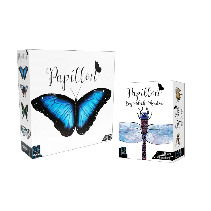 It also contains the expansion Beyond the meadow. In this expansion, predators are on the loose and starting to sneak into your butterfly garden. This expansion captures each of the stretch goals from Kolossal's Papillon Kickstarter campaign. Players introduce predators into their garden that can cause problems for their opponents. Not all is bad, however, as birdbaths can now be built to welcome your feathered friends. Discover everything the garden has to offer beyond the meadow.