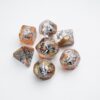 A set of 7 RPG dice with a funny object inside. This set contains a D4, D6, D8, 2X D10, D12 and a D20.