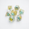 A set of 7 RPG dice with a funny object inside. This set contains a D4, D6, D8, 2X D10, D12 and a D20.