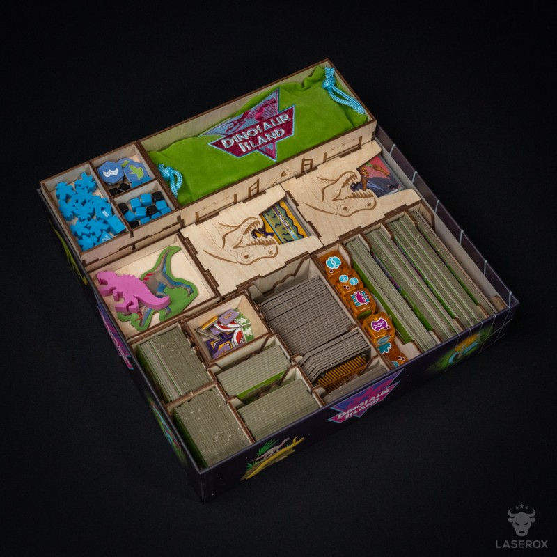 To bring order to the large pile of parts that come with this game, we designed the Dinosaur Organizer. Not only does it speed up game set-up and clean-up, but it also enhances the look of your gaming table with its themed decorations and storing the game pieces that would otherwise be scattered across the table.