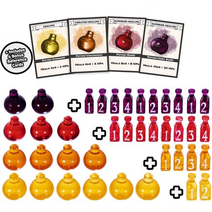 The days of forgetting to use your healing potions at critical moments are over! With these 15 healing potions, you and your fellow players are always visually reminded of exactly how many of each type of healing potion there are.