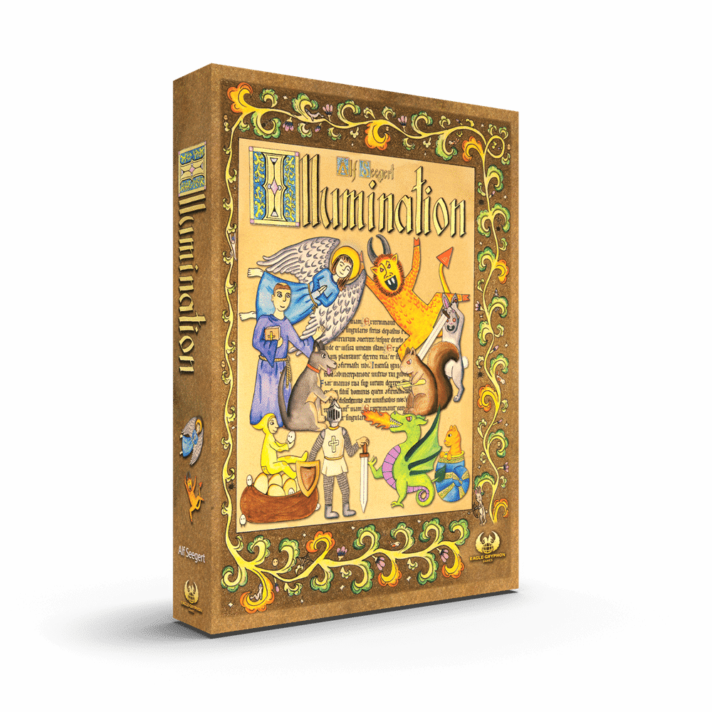 You and your opponent are monks competing to become the new head of the Scriptorium. You do so by illuminating manuscripts with elaborate religious artwork. But not all is as peaceful as it once was! Possessed with eccentric enthusiasm, one of you has turned from the reverent to the irreverent by scrawling demons instead of angels and by painting fierce dragons instead of noble knights. Who will become the new master of the Scriptorium? Will it be the monk who reverently illuminates the page with monks, dogs, knights and angels; or the irreverent monk who whimsically draws the forces of rabbit, squirrel, dragon and demon? Play Illumination to find out!