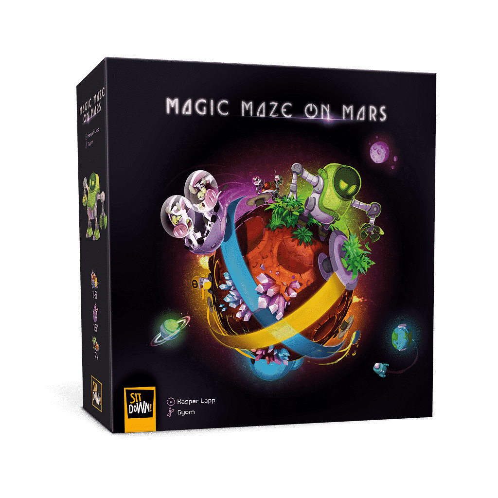 Magic Maze on Mars is a real-time cooperative game. Each player can, at any time, control a pawn to perform a very specific action that other players do not have access to: move on a green, blue, orange track, explore a new zone, feed the space snail, etc. This requires careful cooperation between all players to move the pawns wisely and reach the goal before the hourglass runs out.