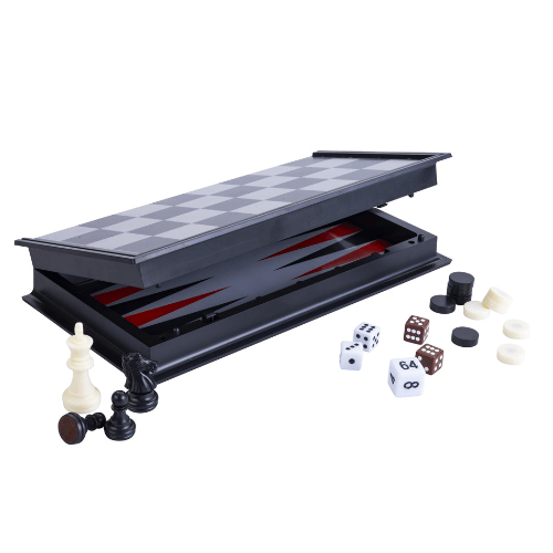 Het reis schaak/ backgammonbord is zowel magnetisch als opklapbaar en heeft een compact formaat van 24 x 24 cm. Aan één zijde is het bord voorzien van zwart-witte velden om te schaken. De andere zijde is een backgammonbord. Alle accessoires waaronder de dobbelstenen en schaakstukken zijn inbegrepen.