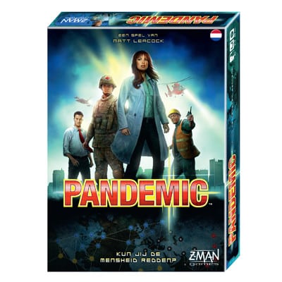 Dutch edition of the board game classic Pandemic! In this cooperative board game, players are members of an elite team that goes to battle against four particularly deadly diseases (a pandemic outbreak!). The team travels around the world to stem the tide of infections and gain knowledge and resources to develop medicines. Can you save humanity? Q