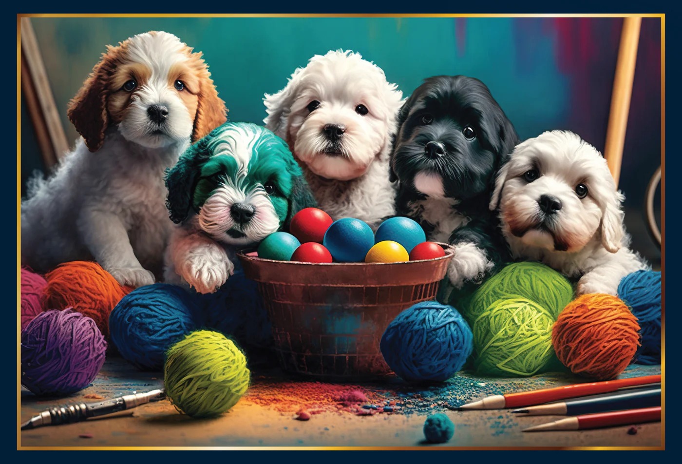 The Artistic Puppies puzzle from Piece of Mind is the perfect challenge for puzzle enthusiasts looking for a cute and colorful puzzle. This jigsaw puzzle features five playful puppies who look like true artists with colorful balls of yarn, colorful pencils and other creative materials on a vibrant background. Each puppy has its own unique markings, making this puzzle extra fun and challenging to put together.