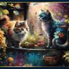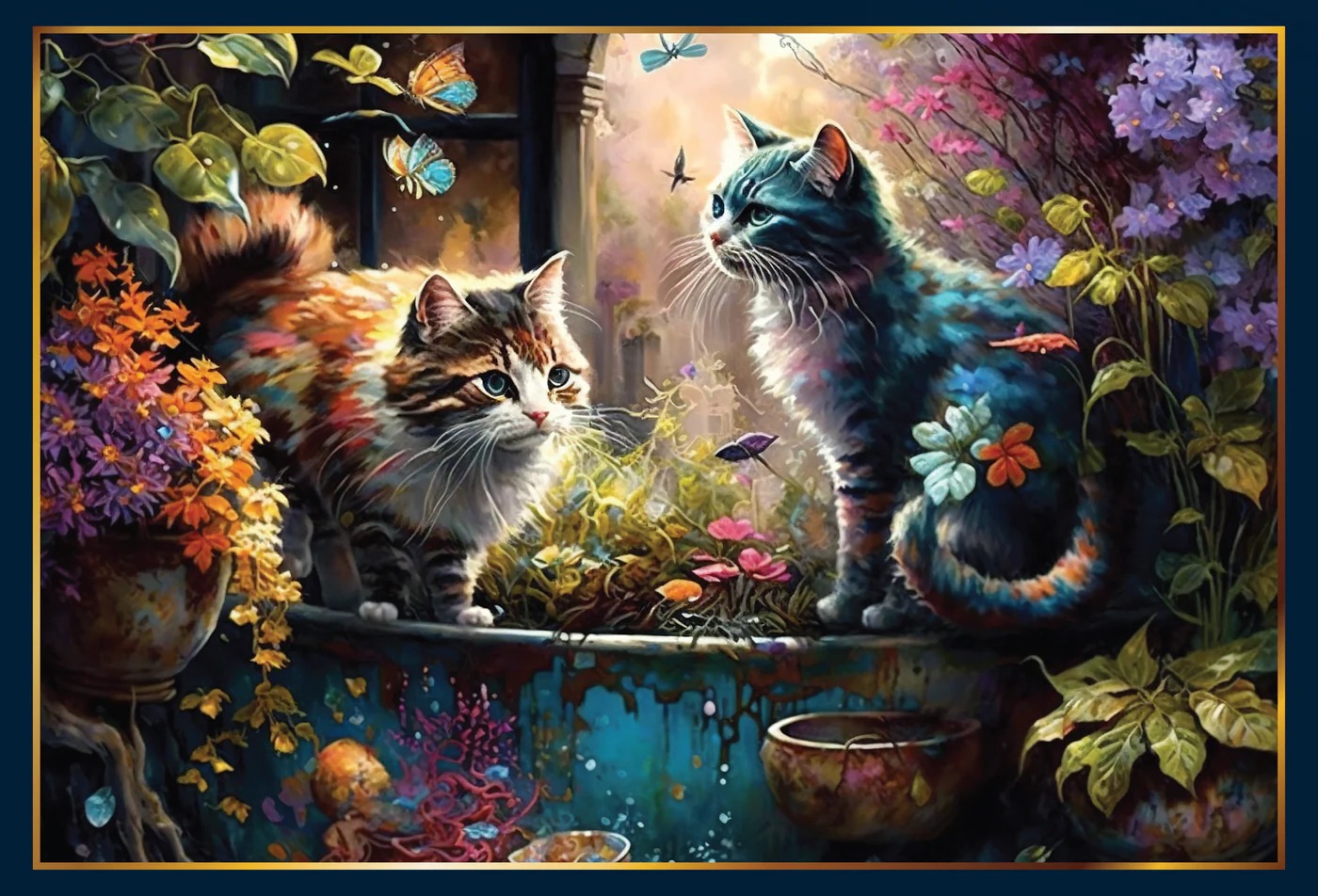The Cat Garden puzzle takes you to a peaceful and lively garden. The cats are surrounded by a colorful garden full of life, with many flowers in shades of orange, purple, green and pink. There are also flower pots scattered throughout the image, adding to the charm of the puzzle. The cats look curiously at all the life around them, with the left cat having an orangey color with white fur, and the right cat having blue fur with a white chest. The right cat stands straight and proud, while the left cat appears to be jumping at something.
