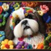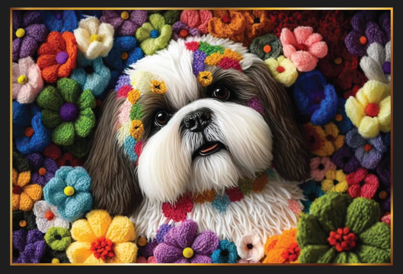 The puzzle is a Work of Art of Knitted Flowers and Cute Shih-Tzus
