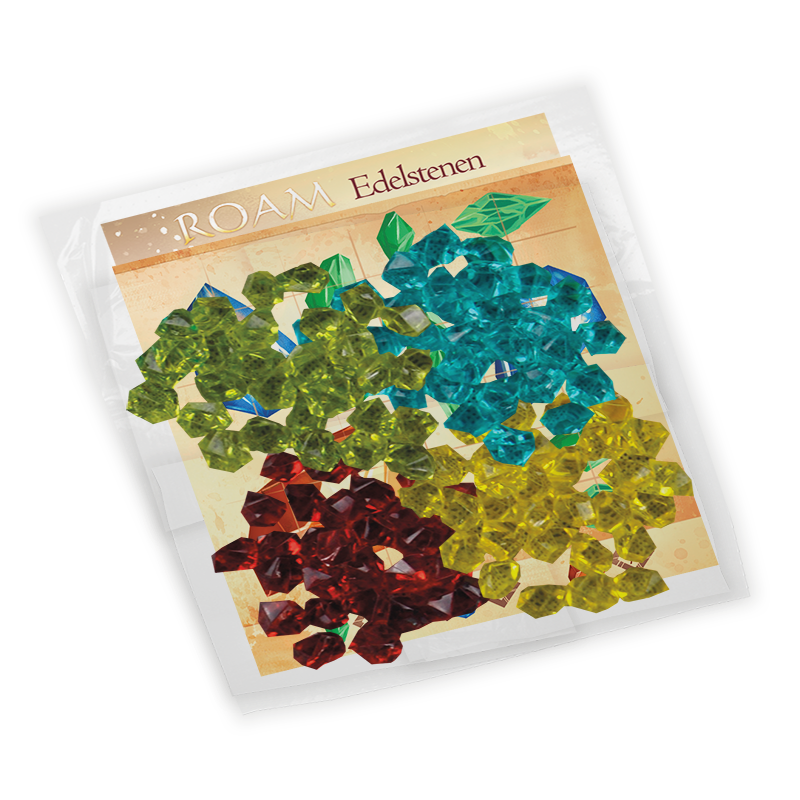 This expansion for Roam adds a gem card and gems to the game. Each player receives a gem card at the start of the game. Players can collect gems during their turn that can be placed on the spaces of the gem card. At the end of the game, completed gem patterns on the gem card give the player extra points at the end of the game.