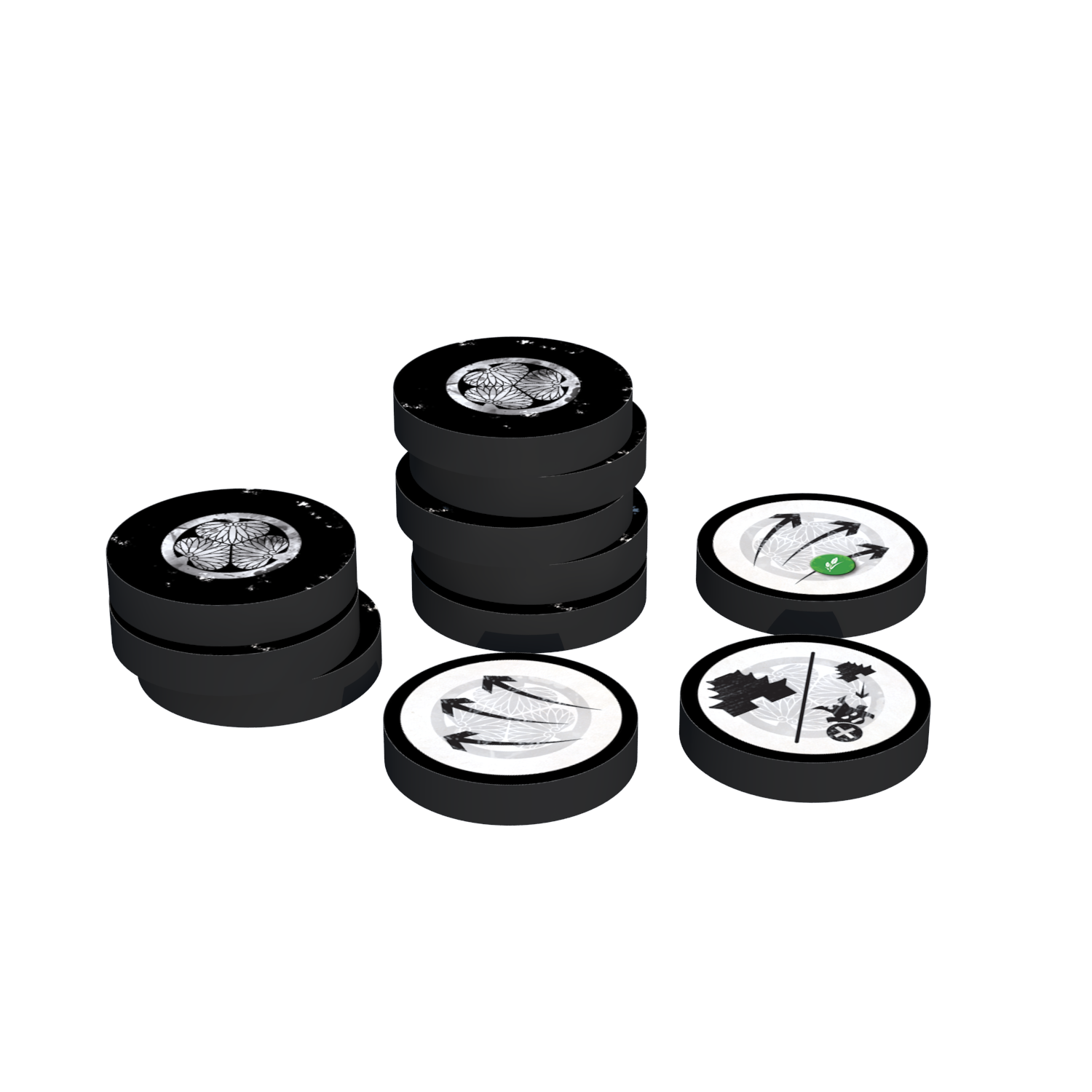 A deluxe wooden token set for the Tokugawa house from the Rise of Tokugawa expansion of Small Samurai Empires, including 11 x Tokugawa Order Tokens.