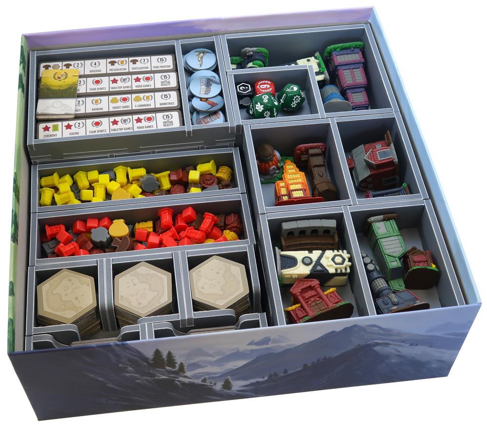 Tapestry insert from Folded Space is compatible with Tapestry®, including the Plans & Ploys® and Arts & Architecture® extensions. The design offers both efficient storage and improved gameplay. Many of the trays can be used during the game and they help immensely with set up and clean up. The boards and rule books act as a lid on the trays.