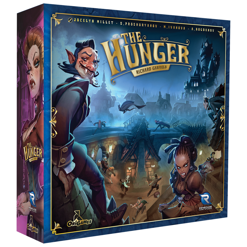 The Hunger is a game about vampires. Vampires awaken from their deep sleep just as the eternal roses bloom. You have until dawn to reach the labyrinth and pick the most beautiful rose. Along the way, you'll hunt people, recruit allies, complete quests and increase your powers. All that to become the most infamous vampire! The Hunger is a deck-building racing game by Richard Garfield. Hunting is necessary, but the more you hunt, the slower you become due to the cards in your deck. Will you make it back to the castle before the first sunlight, or will you burn ingloriously to ashes...
