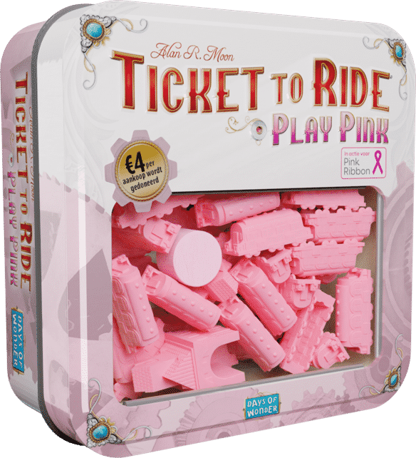 Play Pink is a special pink train set for the Ticket to Ride board game! But Play Pink is more: with this exclusive set (in the pink color of Pink Ribbon), Asmodee is committed to the fight against breast cancer locally.
