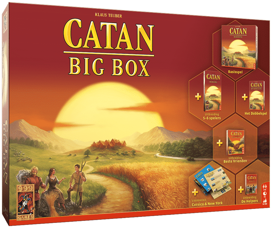 Met deze Catan Big Box krijgen nieuwe spelers er direct een aantal uitbreidingen en accessoires bij om het populaire handelsspel “Catan” op verschillende manieren te kunnen spelen. Zo kunnen ze direct met 5 of 6 spelers aan de gang of de nieuwe speelborden uitproberen. De meegeleverde uitbreidingen en scenario’s zorgen voor de nodige afwisseling. Ook zit Catan: Het Dobbelspel in de doos, een leuke “roll & write”-versie van de ultieme klassieker!