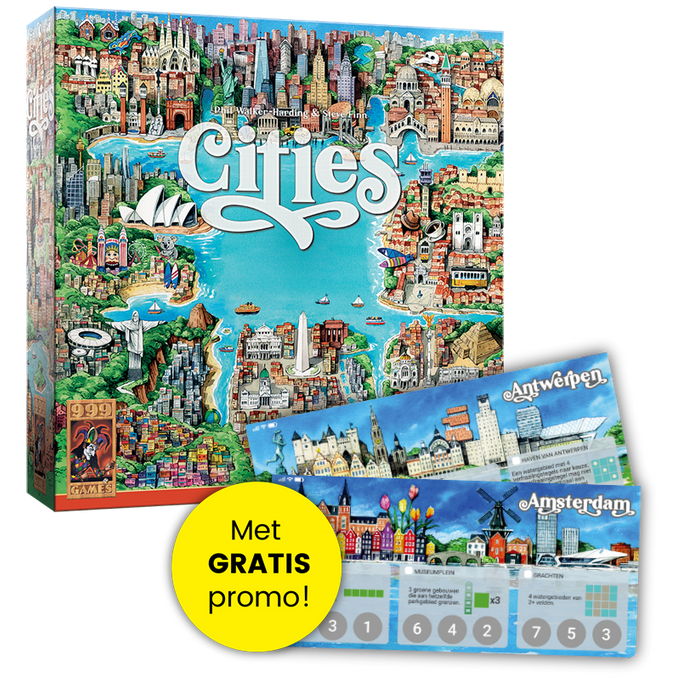 Neem de leiding in de ontwikkeling van een aantal bekende steden in Cities, een stadsspel waarbij je de beste projecten selecteert en ze rangschikt in je eigen speelgebied. Ontworpen door Steve Finn en Phil Walker Harding en geïllustreerd door Jorge Tabanera, biedt het spel veel speelplezier voor jong en oud. Met mechanismen voor actie en grondstoffenverzameling krijg je de kans om de steden van Sydney, Londen, New York, Barcelona, Rio de Janeiro, Lissabon, Mexico-Stad en Buenos Aires te bezoeken.