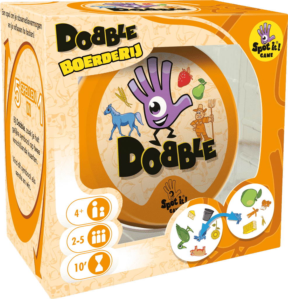 Dobble Boerderij bevat 30 speelkaarten waarop steeds 6 symbolen afgebeeld staan. Denk daarbij bijvoorbeeld aan een tractor, varken, appel, konijn en een molen. Er zijn 5 verschillende mini-spelletjes die je hiermee kunt spelen, elk met eigen regels. De kaarten zijn verpakt in een handzaam blikje en het spel is tevens ideaal om iemand als cadeau te geven.