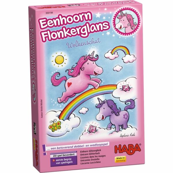 De vier eenhoorns, Flonkerglans, Sterrenstof, Wonderbloem en Toverstaart, leven in het verre wolkenland. Uitgelaten galopperen ze over de wattenwolkjes, glijden langs de kleurige regenbogen omlaag of spelen met de fonkelende wolkenkristallen. Daar komt plotseling een onweer opzetten! Wie helpt de eenhoorns zo snel mogelijk bij de zon te komen en op weg daarheen nog zoveel mogelijk wolkenkristallen in veiligheid te brengen?Wie de meeste wolkenkristallen redt, wint het spel.