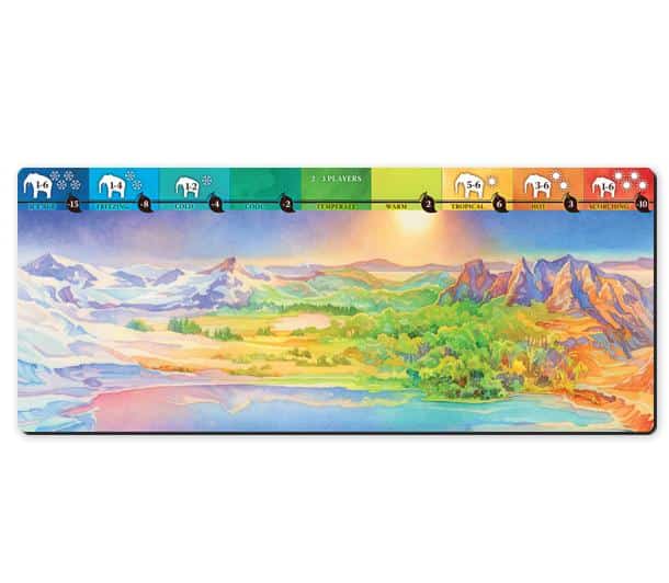 The CLIMATE playmat is a double sided neoprene mat made to replace the CLIMATE board. One side is for 2-3 players, while the other is for 4-6. The mat is approximately 31 x 8.75