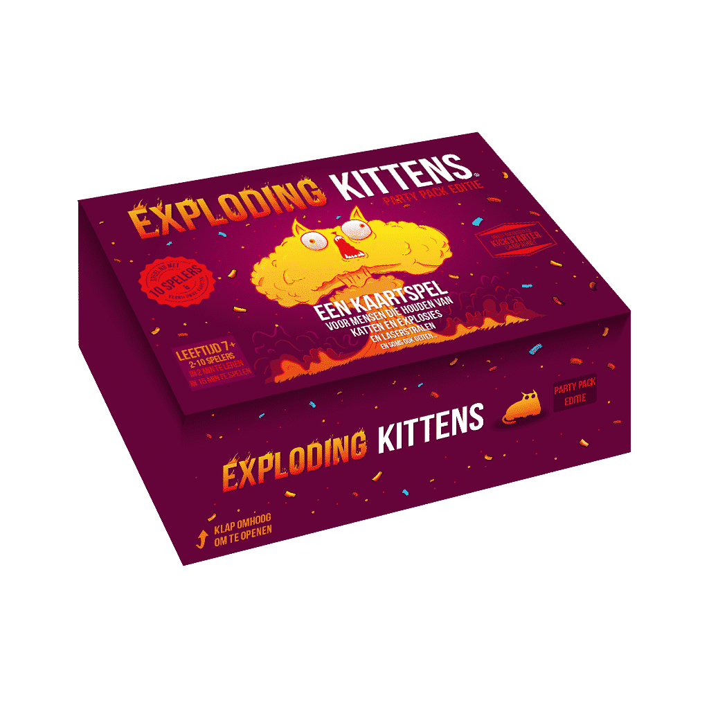 Exploding Kittens Party Pack – Het wordt feest met de Nederlandstalige Exploding Kittens Party Pack! Speel het hilarische kaartspel Exploding Kittens nu met maar liefst 120 vernieuwde kaarten, geschikt voor maximaal 10 spelers. Bij 2-3 spelers gebruik je alleen de kaarten met de speciale pootafdruk, bij 4-7 spelers alleen de kaarten zonder een pootafdruk, bij 8-10 spelers gebruik je alle kaarten.