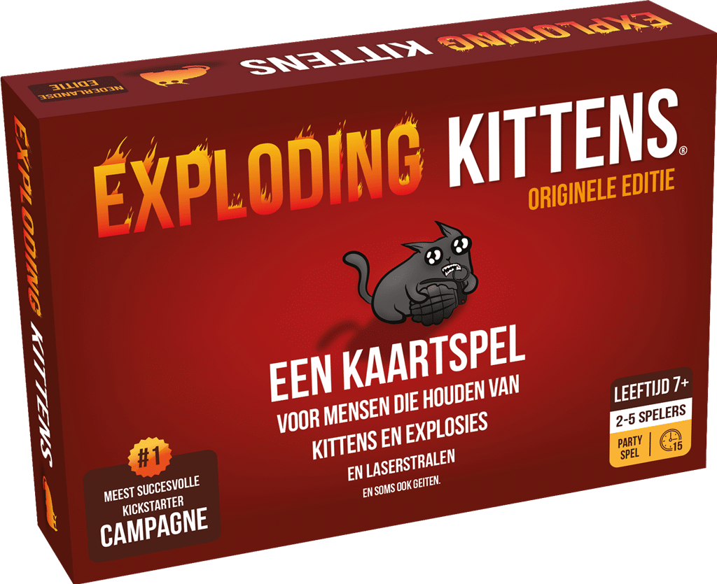 Het kaartspel Exploding Kittens is voor mensen die van katten, explosies en lasers houden! Dit spel is het meest succesvolle project ooit op Kickstarter! Exploding Kittens is gemaakt door Elan Lee (XBOX), Matthew Inman (The Oatmeal) en Shane Small (XBOX, Marvel) en is een soort Russisch roulette spel: je neemt een kaart van de stapel tot je een exploding kitten kaart krijgt, op dat moment heb je verloren. Met alle andere kaarten kan je je verdedigen, aanvallen, een beurt overslaan of de katten afleiden.. Deze standaardeditie van het spel is geschikt voor 2-5 spelers vanaf 7 jaar en bevat 56 kaarten en instructies in een fraaie box.