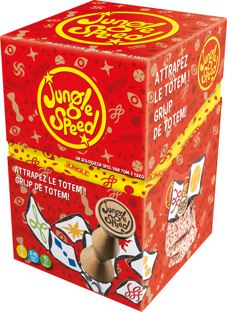 Hardbox uitgave van het klassieke, razendsnelle kaartspel Jungle Speed waarbij je probeert zo snel mogelijk al jouw speelkaarten kwijt te raken. Spelers draaien ieder om de beurt, volgens de wijzers van de klok, de bovenste kaart van hun stapel op hun eigen aflegstapel. Als 2 spelers een kaart met hetzelfde symbool omdraaien (ongeacht de kleur), vindt er een duel plaats. De eerste van hen die de totem grijpt, wint het duel. De verliezer krijgt de afgelegde kaarten van zijn tegenstander, evenals zijn eigen afgelegde kaarten en de eventuele kaarten in de pot.