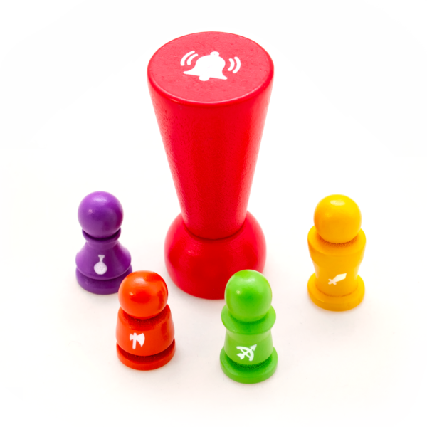 4 kleurrijke pionnen, gestempeld in de vorm van je favoriete personages en 1 GROTE rode Do Something! pion.