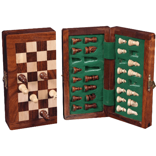 Productomschrijving Magnetisch opklapbaar houten schaakbord met stukken