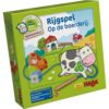 Inhoud: 2 rijgsnoeren met stal, 1 koe, 1 kalf, 1 paard, 1 veulen, 1 klaverblad, 1 bloem, 1 melkbus, 1 hoefijzer, 4 opgavenkaarten, 1 zakje.
