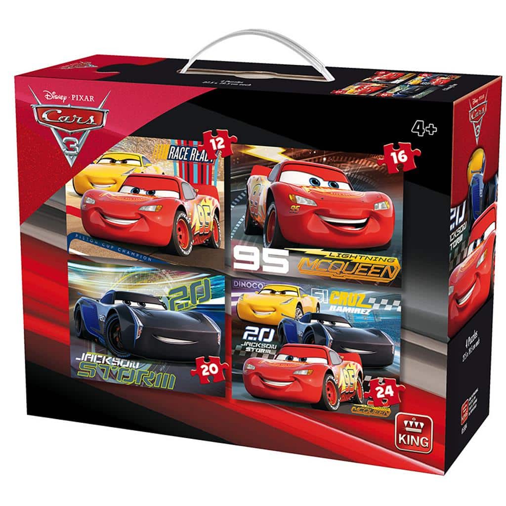 Deze set bevat 4 puzzels van 12, 16, 20 en 24 puzzelstukjes met afbeeldingen van Bliksem McQueen en zijn rivaal Jackson Storm uit de film Cars 3. De puzzels zitten in een doos met een handvat zodat je ze makkelijk mee kan nemen. Geschikt voor kinderen vanaf 4 jaar.