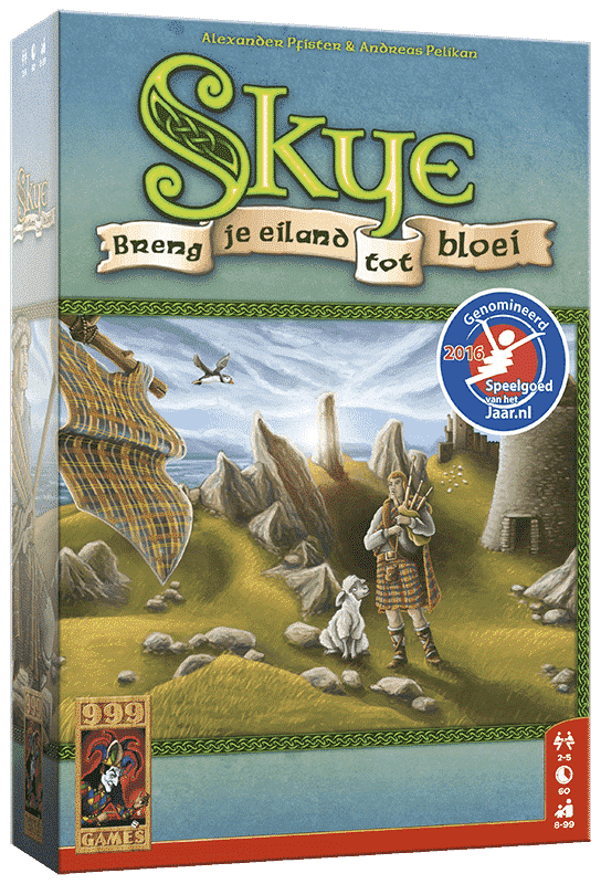 In dit vlotte en gevarieerde bied- en legspel bouw je met landtegels een territorium dat zoveel mogelijk punten moet opleveren. Welke elementen scoren, is echter elk spel verschillend! Elke ronde trek je 3 tegels, waarvan je er in het geheim 1 aflegt en de prijs van de andere 2 bepaalt. Daarna koopt elke speler er 1 van een ander tegen de gestelde prijs. Tegels die je overhoudt, mag je zelf bouwen, maar het geld erop ben je kwijt. Aan het einde van elke ronde bepalen scoretegels waar je punten voor krijgt. Omdat die al aan het begin van het spel zichtbaar zijn, kun je daar rekening mee houden en je tactiek erop afstemmen. Omdat er maar 4 van de vele scoretegels in het spel komen, is Skye iedere keer weer volledig anders! Skye is een uitdagend en interactief spel met verrassend eenvoudige spelregels!