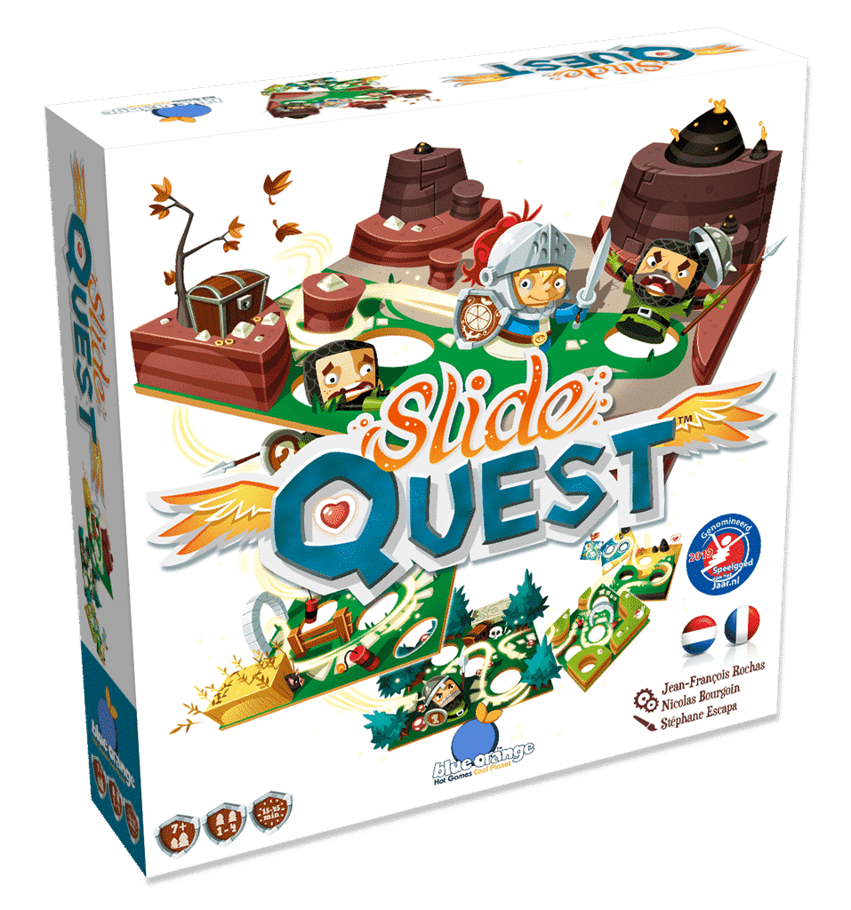 De slechteriken hebben de controle over ons prachtige koninkrijk overgenomen in Slide Quest en het is een puinhoop! Je moet de wereld redden, en snel! Laat ons samen deze dappere, rollende ridder leiden door dit turbulente avontuur, bezaaid met valkuilen en wendingen… Slide Quest is een fantastisch bordspel waarbij je probeert om de ridder te helpen om het einde van elke kaart te bereiken en daarbij valstrikken en obstakels te vermijden. Gebruik de hendels (die je aan de doos vastmaakt) om de ridder te laten schuiven, maar let op: er zijn diverse hindernissen, bewakers en een schurk die jouw weg moeilijk maken en jouw levensteller laten dalen… Er zijn in totaal 20 kaarten (4 verschillende werelden met elk 5 kaarten) die je kunt spelen: om het spel te winnen probeer je de ridder veilig en succesvol door een wereld van 5 kaarten (bij een kleine queeste) of de volledige 20 kaarten (grote queeste) te loodsen en het koninkrijk te redden. De moeilijkheidsgraad wordt hoger naarmate je van de ene naar de andere wereld gaat. Als je levensteller echter op nul komt, dan verlies je het spel. Inhoud: 1 spelbord met vallen, 4 hendels, 20 landschapskaarten, 1 rollende ridder, 8 obstakels, 9 vallen, 1 levensteller, 1 ‘hart’-steen, 1 Spelbewaarder en een spelhandleiding.