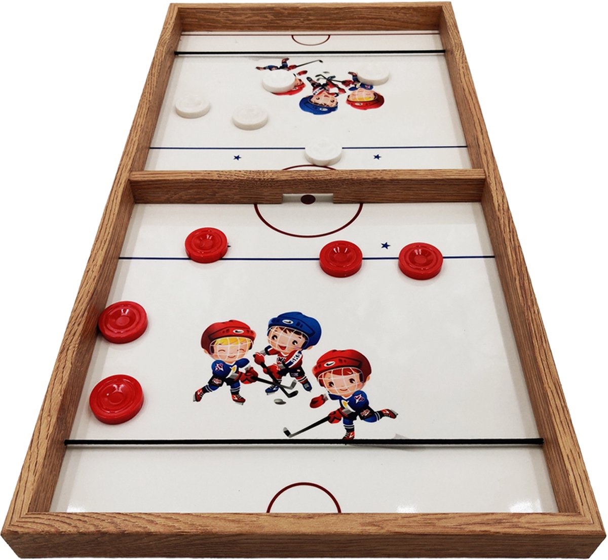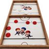 In het spel Sling Puck zijn precisie en handelingssnelheid van groot belang. Je speelt dit houten spel met z’n tweeën. Een echte één-op-één wedstrijd waarbij het er chaotisch aan toe kan gaan. Dit hoogwaardige Sling Puck speelbord van het merk Yenigun heeft een afmeting van 63.5 x 33.5 cm. De print van de schattige kinderen zorgt direct voor een vrolijk gevoel! Op het speelbord is een hoogglans lak aangebracht voor optimale bescherming. Daarnaast zorgt de lak ervoor dat de pucks gemakkelijker over het veld glijden. De set wordt geleverd met 5 witte en 5 rode pucks.