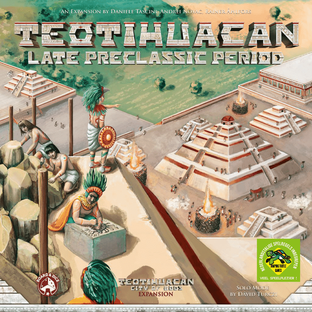 Teotihuacan: Late Preclassic Period is a modular expansion which introduces several new options to enrich and expand the game experience. Asymmetrical player powers give each player a unique benefit. A prestigious fourth temple allows unlocking of permanent powerful abilities, while being much more difficult to advance on. Variable effects impact each season and eclipse. New engineering techniques and renewed plans for beautifying the central Pyramid of the Sun offer fresh challenges and possibilities.